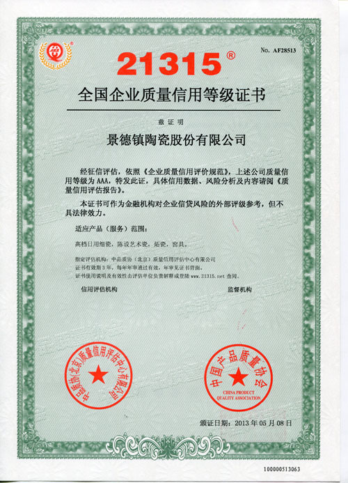景德镇BG电子官网股份公司再次荣获“天下企业质量信用品级AAA级证书”