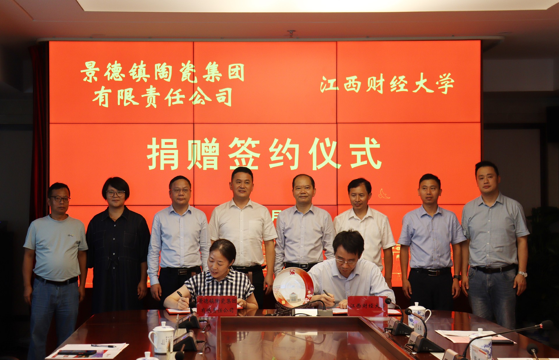 签约仪式上,,,,,,吴爱云代表景陶集团与江西财经大学签署捐赠协议,,,,,,并捐赠纪念瓷盘,,,,,,邓景扬代表景陶集团接受江西财大揭晓的《捐赠证书》。。。。。。