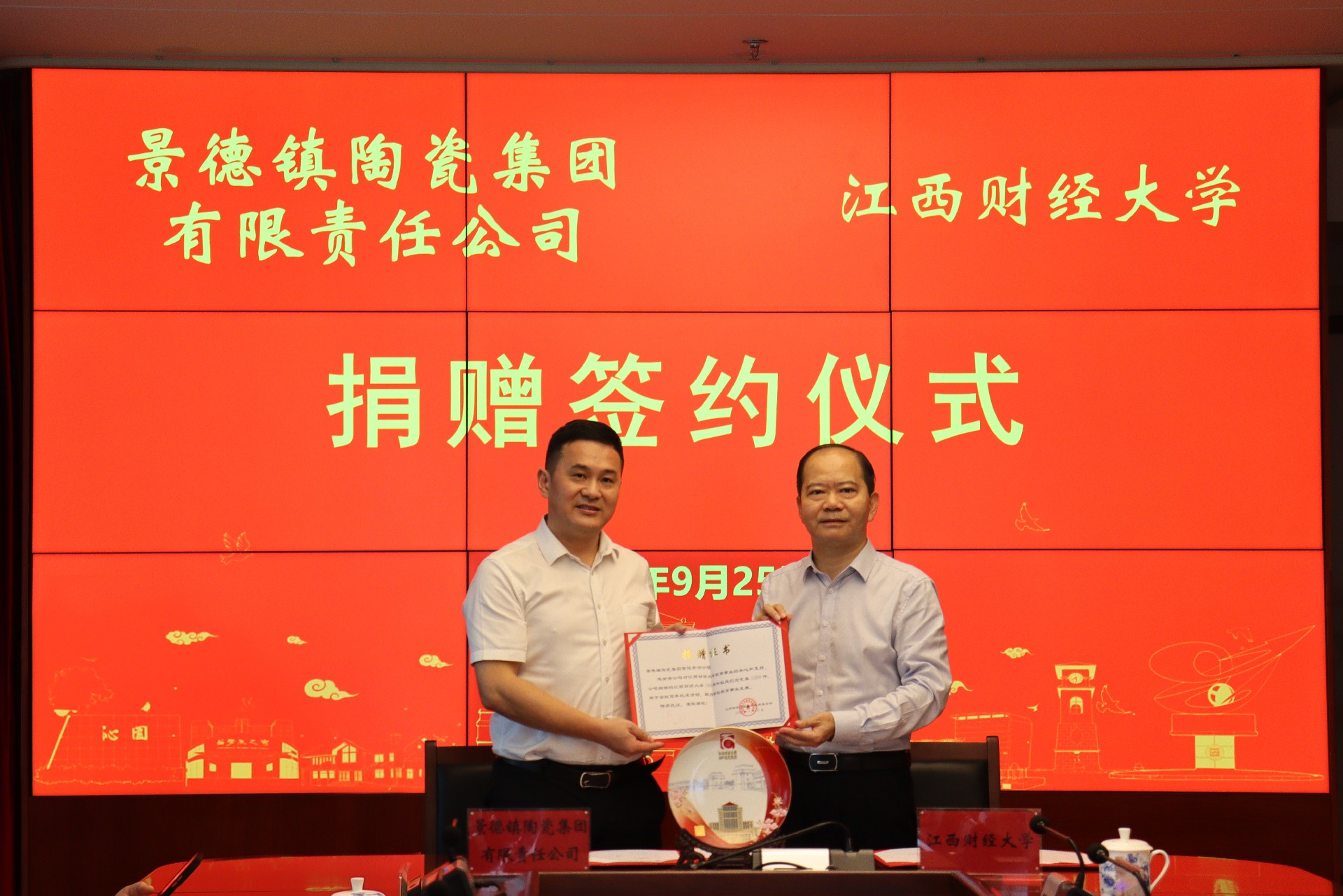 9月25日上午,,,,,,景陶集团党委书记、董事长邓景扬带队赴江西财经大学,,,,,,加入为庆祝江西财经大学百年校庆捐赠纪念瓷盘签约仪式,,,,,,仪式在江西财大蛟桥园图文信息大楼举行。。。。。。江西财经大学党委常委、副校长李春根,,,,,,党办校办副主任王智明、校友联络效劳中心副主任周江军、财税与公共治理学院科研与研究生办公室主任纪江,,,,,,景陶集团副总司理吴爱云、营销策划部部长占小明、设计部部长杨鹏等出席捐赠签约仪式。。。。。。捐赠仪式由江西财经大学财税与公共治理学院党委书记段远鸿主持。。。。。。